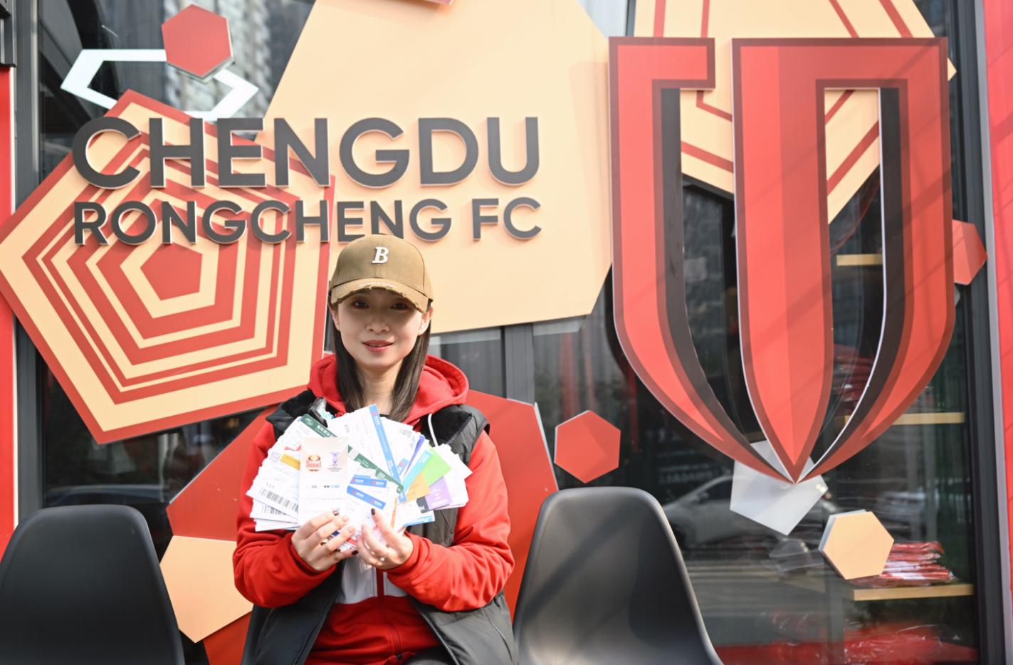 2月5日,红星新闻记者与白芸约在成都蓉城训练基地门前的官方球迷商店见面。这位两个小孩的妈妈戴着标志性的棒球帽,穿着一件成都蓉城的红色运动外套和羽绒马甲,一看就是资格、地道的成都球迷。“其实我还是有些意外的!”在谈到自己独享成都蓉城“2025赛季主客场全勤球迷”这一荣誉时,白芸说:“此前俱乐部相关工作人员找到我核实一些场次的现场观战信息,所以我知道这个事情,但没想到我是独一份!那天俱乐部官方发布消息后,我没有第一时间看到,后来看手机,亲朋好友发来的信息都要爆了!确实很荣幸,也弥补了我在2024年因为一个客场未成行,而未能在那年实现联赛和足协杯主客场全勤的遗憾。”